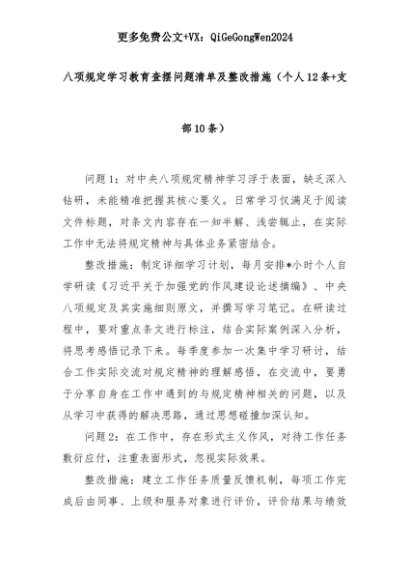 【七哥公文】2025年:八项规定学习教育查摆问题清单及整改措施(个人12条+支部10条)+更多免费公文+VX:QiGeGongWen2024+更多免费公文+VX:QiGeGongWen2024