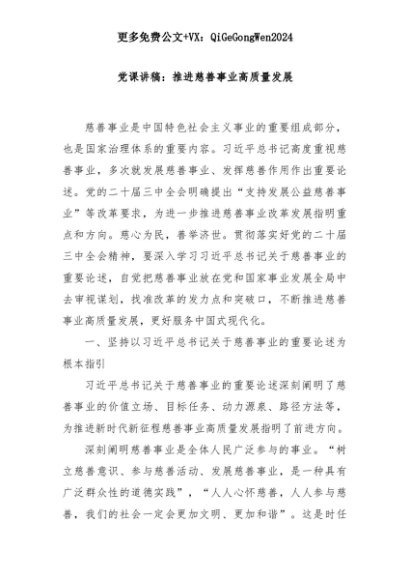 【七哥公文】2025年:党课讲稿:推进慈善事业高质量发展+更多免费公文+VX:QiGeGongWen2024+更多免费公文+VX:QiGeGongWen2024