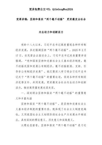 【七哥公文】2025年:党课讲稿:坚持和落实“两个毫不动摇” 更好激发全社会内生动力和创新活力+更多免费公文+VX:QiGeGongWen2024+更多免费公文+VX:QiGeGongWen2024