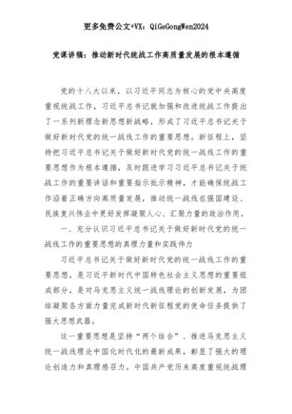 【七哥公文】2025年:党课讲稿:推动新时代统战工作高质量发展的根本遵循+更多免费公文+VX:QiGeGongWen2024+更多免费公文+VX:QiGeGongWen2024