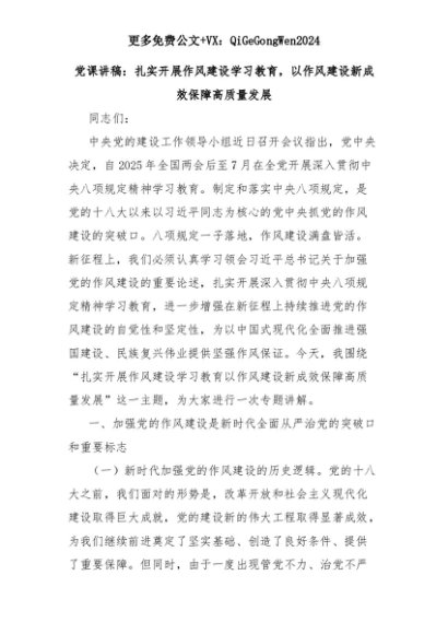【七哥公文】2025年:党课讲稿:扎实开展作风建设学习教育,以作风建设新成效保障高质量发展+更多免费公文+VX:QiGeGongWen2024+更多免费公文+VX:QiGeGongWen2024