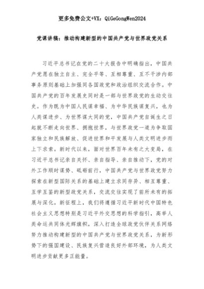 【七哥公文】2025年:党课讲稿:推动构建新型的中国共产党与世界政党关系+更多免费公文+VX:QiGeGongWen2024+更多免费公文+VX:QiGeGongWen2024