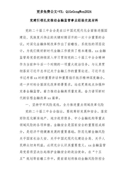 【七哥公文】2025年:党建引领扎实推动金融监管事业经验交流材料+更多免费公文+VX:QiGeGongWen2024+更多免费公文+VX:QiGeGongWen2024