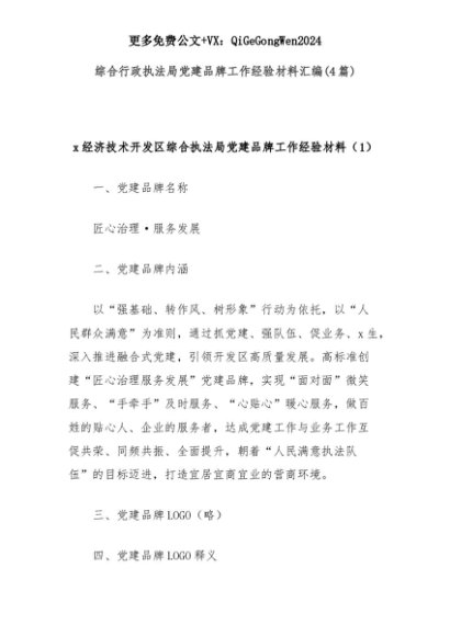 【七哥公文】2025年:(4篇)综合行政执法局党建品牌工作经验材料汇编+更多免费公文+VX:QiGeGongWen2024+更多免费公文+VX:QiGeGongWen2024