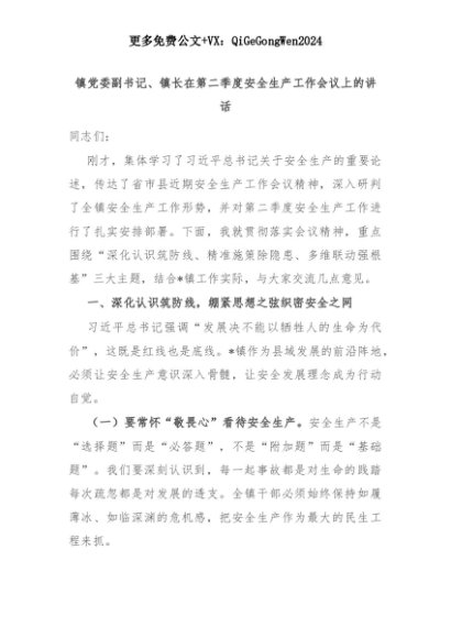 【七哥公文】2025年:镇党委副书记、镇长在第二季度安全生产工作会议上的讲话+更多免费公文+VX:QiGeGongWen2024+更多免费公文+VX:QiGeGongWen2024