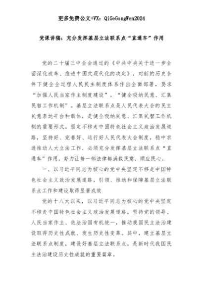 【七哥公文】2025年:党课讲稿:充分发挥基层立法联系点“直通车”作用+更多免费公文+VX:QiGeGongWen2024+更多免费公文+VX:QiGeGongWen2024