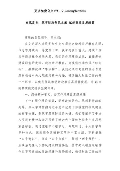 【七哥公文】2025年:交流发言:筑牢财政作风之基 赋能财政发展新篇+更多免费公文+VX:QiGeGongWen2024+更多免费公文+VX:QiGeGongWen2024