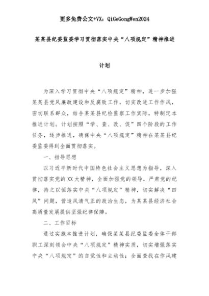 【七哥公文】2025年:某某县纪委监委学习贯彻落实中央“八项规定”精神推进计划+更多免费公文+VX:QiGeGongWen2024+更多免费公文+VX:QiGeGongWen2024