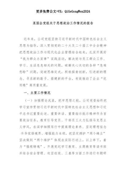 【七哥公文】2025年:某国企党组关于思想政治工作情况的报告+更多免费公文+VX:QiGeGongWen2024+更多免费公文+VX:QiGeGongWen2024