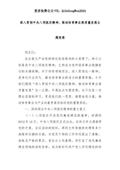 【七哥公文】2025年:深入贯彻中央八项规定精神,推动体育事业高质量发展主题党课+更多免费公文+VX:QiGeGongWen2024+更多免费公文+VX:QiGeGongWen2024