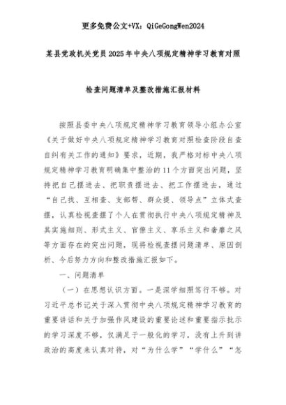 【七哥公文】2025年:某县党政机关党员2025年中央八项规定精神学习教育对照检查问题清单及整改措施汇报材料+更多免费公文+VX:QiGeGongWen2024+更多免费公文+VX:QiGeGongWen2024