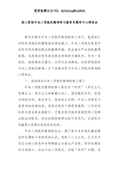 【七哥公文】2025年:深入贯彻中央八项规定精神学习教育专题学习心得体会+更多免费公文+VX:QiGeGongWen2024+更多免费公文+VX:QiGeGongWen2024
