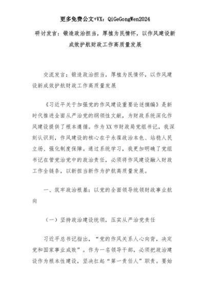 【七哥公文】2025年:研讨发言:锻造政治担当,厚植为民情怀,以作风建设新成效护航财政工作高质量发展+更多免费公文+VX:QiGeGongWen2024+更多免费公文+VX:QiGeGongWen2024