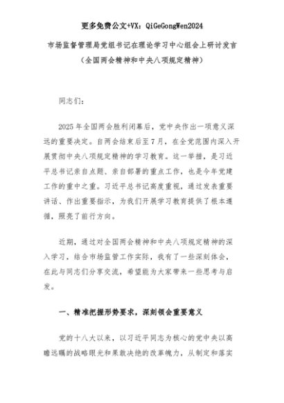 【七哥公文】2025年:市场监督管理局党组书记在理论学习中心组会上研讨发言(全国两会精神和中央八项规定精神)+更多免费公文+VX:QiGeGongWen2024+更多免费公文+VX:QiGeGongWen2024