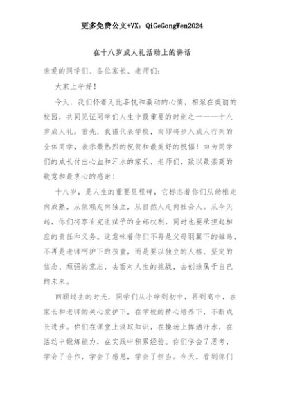 【七哥公文】2025年:在十八岁成人礼活动上的讲话+更多免费公文+VX:QiGeGongWen2024+更多免费公文+VX:QiGeGongWen2024