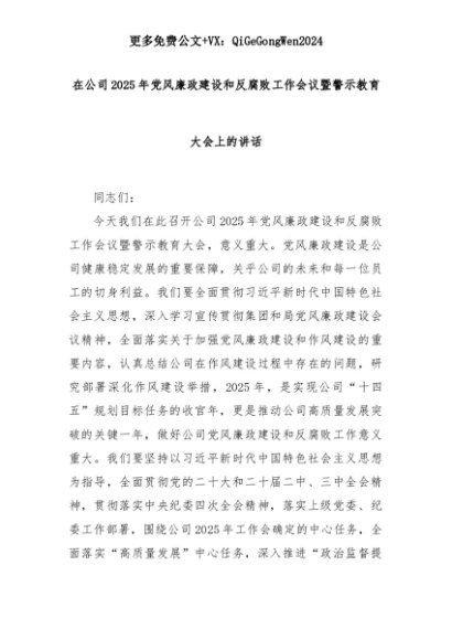 【七哥公文】2025年:在公司2025年党风廉政建设和反腐败工作会议暨警示教育大会上的讲话+更多免费公文+VX:QiGeGongWen2024+更多免费公文+VX:QiGeGongWen2024
