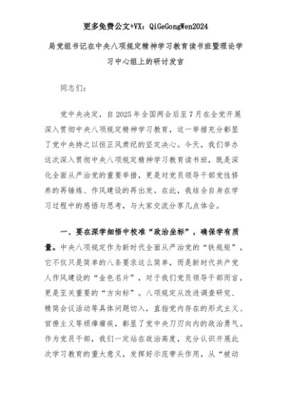 【七哥公文】2025年:局党组书记在中央八项规定精神学习教育读书班暨理论学习中心组上的研讨发言+更多免费公文+VX:QiGeGongWen2024+更多免费公文+VX:QiGeGongWen2024