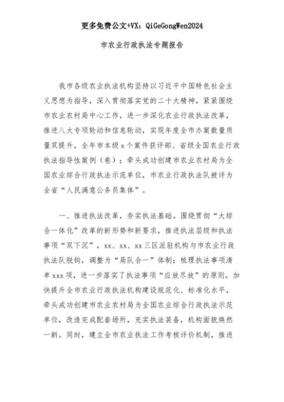 【七哥公文】2025年:市农业行政执法专题报告+更多免费公文+VX:QiGeGongWen2024+更多免费公文+VX:QiGeGongWen2024