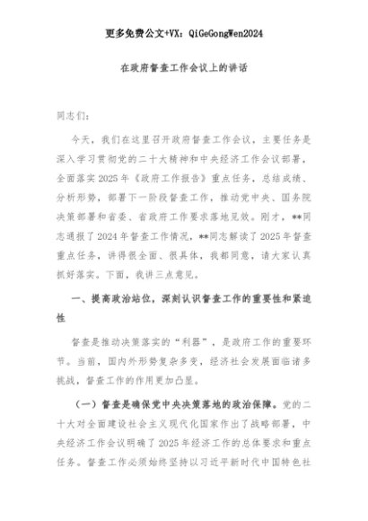 【七哥公文】2025年:在政府督查工作会议上的讲话+更多免费公文+VX:QiGeGongWen2024+更多免费公文+VX:QiGeGongWen2024