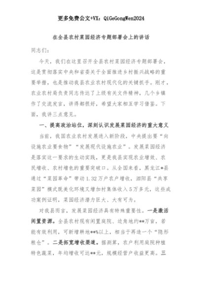 【七哥公文】2025年:在全县农村菜园经济专题部署会上的讲话+更多免费公文+VX:QiGeGongWen2024+更多免费公文+VX:QiGeGongWen2024