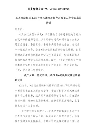 【七哥公文】2025年:在某政法机关2025年党风廉政建设与反腐败工作会议上的讲话+更多免费公文+VX:QiGeGongWen2024+更多免费公文+VX:QiGeGongWen2024