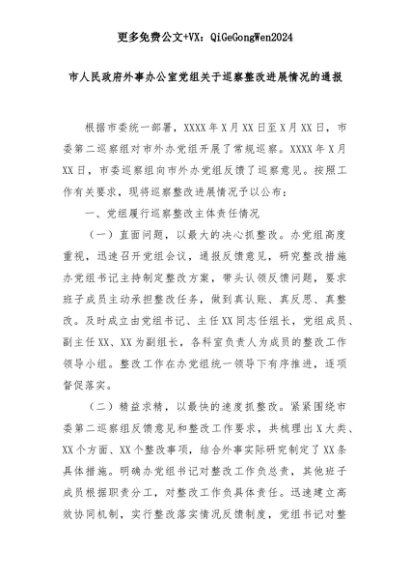 【七哥公文】2025年:市人民政府外事办公室党组关于巡察整改进展情况的通报+更多免费公文+VX:QiGeGongWen2024+更多免费公文+VX:QiGeGongWen2024