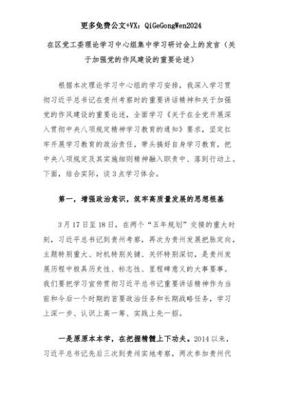 【七哥公文】2025年:在区党工委理论学习中心组集中学习研讨会上的发言(关于加强党的作风建设的重要论述)+更多免费公文+VX:QiGeGongWen2024+更多免费公文+VX:QiGeGongWen2024