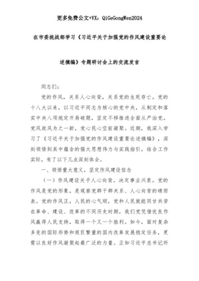 【七哥公文】2025年:在市委统战部学习《习近平关于加强党的作风建设重要论述摘编》专题研讨会上的交流发言+更多免费公文+VX:QiGeGongWen2024+更多免费公文+VX:QiGeGongWen2024
