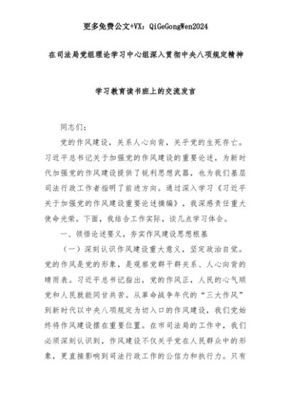 【七哥公文】2025年:在司法局党组理论学习中心组深入贯彻中央八项规定精神学习教育读书班上的交流发言+更多免费公文+VX:QiGeGongWen2024+更多免费公文+VX:QiGeGongWen2024