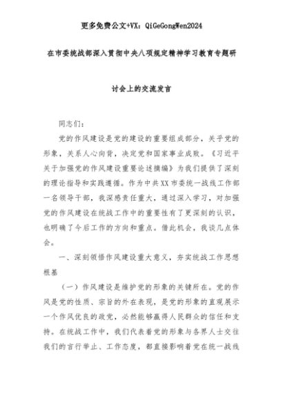 【七哥公文】2025年:在市委统战部深入贯彻中央八项规定精神学习教育专题研讨会上的交流发言+更多免费公文+VX:QiGeGongWen2024+更多免费公文+VX:QiGeGongWen2024