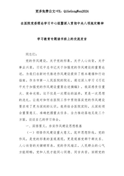 【七哥公文】2025年:在医院党委理论学习中心组暨深入贯彻中央八项规定精神学习教育专题读书班上的交流发言+更多免费公文+VX:QiGeGongWen2024+更多免费公文+VX:QiGeGongWen2024