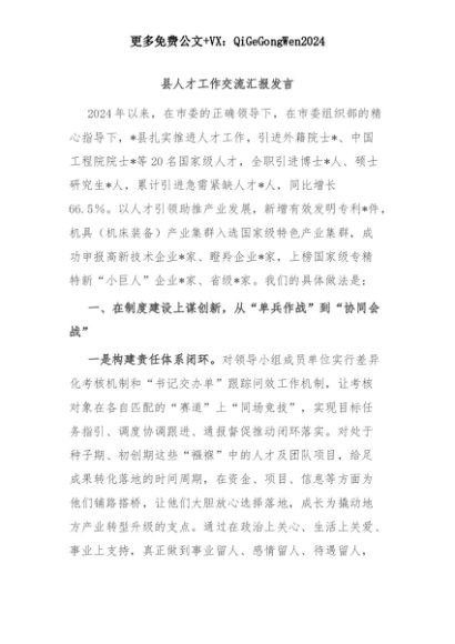 【七哥公文】2025年:县人才工作交流汇报发言+更多免费公文+VX:QiGeGongWen2024+更多免费公文+VX:QiGeGongWen2024