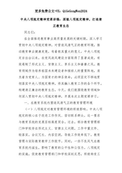 【七哥公文】2025年:中央八项规定精神党课讲稿:深植八项规定精神,打造清正教育生态+更多免费公文+VX:QiGeGongWen2024+更多免费公文+VX:QiGeGongWen2024