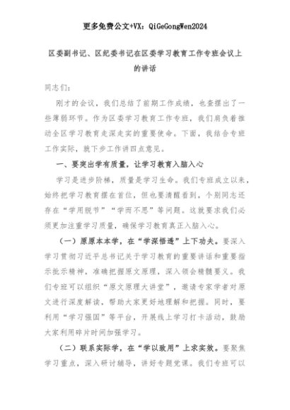【七哥公文】2025年:区委副书记、区纪委书记在区委学习教育工作专班会议上的讲话+更多免费公文+VX:QiGeGongWen2024+更多免费公文+VX:QiGeGongWen2024