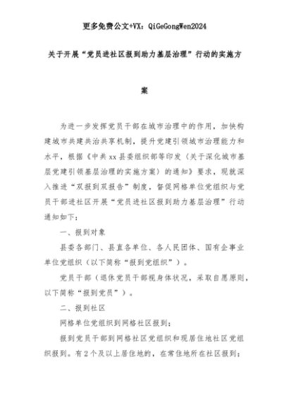 【七哥公文】2025年:关于开展“党员进社区报到助力基层治理”行动的实施方案+更多免费公文+VX:QiGeGongWen2024+更多免费公文+VX:QiGeGongWen2024