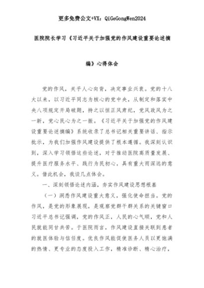 【七哥公文】2025年:医院院长学习《习近平关于加强党的作风建设重要论述摘编》心得体会+更多免费公文+VX:QiGeGongWen2024+更多免费公文+VX:QiGeGongWen2024