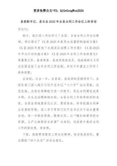 【七哥公文】2025年:县委副书记、县长在2025年全县水利工作会议上的讲话+更多免费公文+VX:QiGeGongWen2024+更多免费公文+VX:QiGeGongWen2024