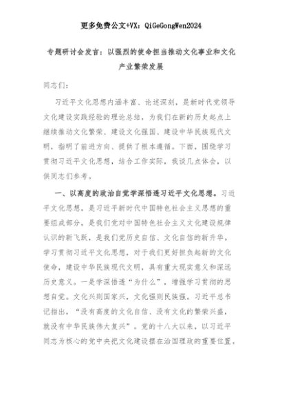 【七哥公文】2025年:专题研讨会发言:以强烈的使命担当推动文化事业和文化产业繁荣发展+更多免费公文+VX:QiGeGongWen2024+更多免费公文+VX:QiGeGongWen2024