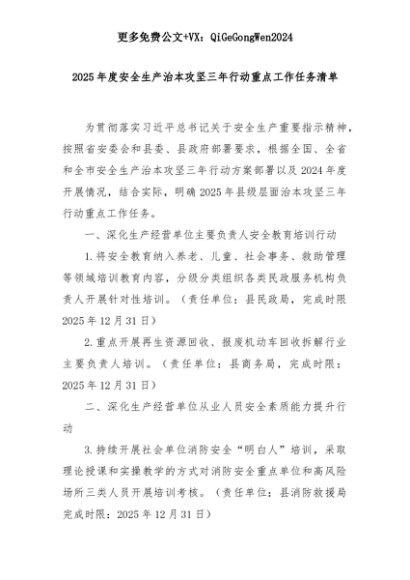 【七哥公文】2025年:2025年度安全生产治本攻坚三年行动重点工作任务清单+更多免费公文+VX:QiGeGongWen2024+更多免费公文+VX:QiGeGongWen2024