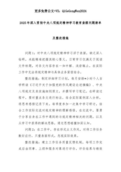 【七哥公文】2025年:2025年深入贯彻中央八项规定精神学习教育查摆问题清单及整改措施+更多免费公文+VX:QiGeGongWen2024+更多免费公文+VX:QiGeGongWen2024