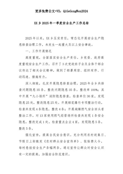 【七哥公文】2025年:XX乡2025年一季度安全生产工作总结+更多免费公文+VX:QiGeGongWen2024+更多免费公文+VX:QiGeGongWen2024