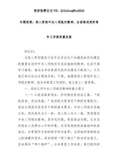 【七哥公文】2025年:专题党课:深入贯彻中央八项规定精神,全面推进党的青年工作高质量发展+更多免费公文+VX:QiGeGongWen2024+更多免费公文+VX:QiGeGongWen2024
