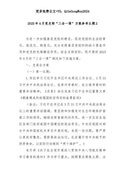 【七哥公文】2025年:2025年4月党支部“三会一课”方案参考主题2+更多免费公文+VX:QiGeGongWen2024+更多免费公文+VX:QiGeGongWen2024