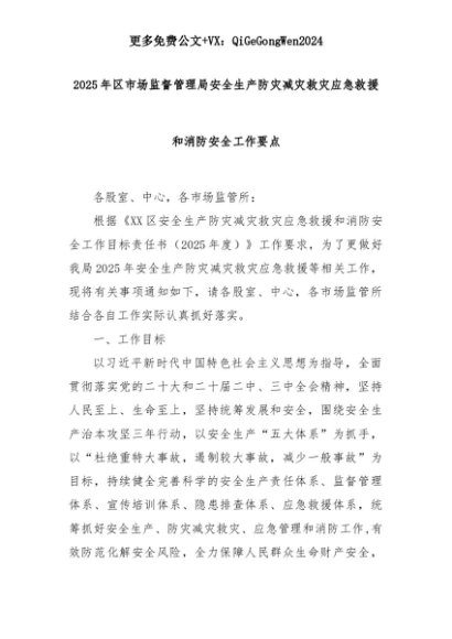 【七哥公文】2025年:2025年区市场监督管理局安全生产防灾减灾救灾应急救援和消防安全工作要点+更多免费公文+VX:QiGeGongWen2024+更多免费公文+VX:QiGeGongWen2024