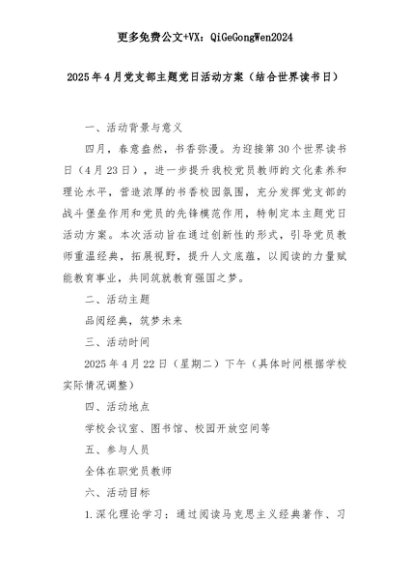 【七哥公文】2025年:2025年4月党支部主题党日活动方案(结合世界读书日)+更多免费公文+VX:QiGeGongWen2024+更多免费公文+VX:QiGeGongWen2024