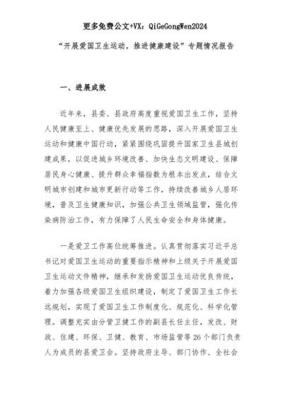 【七哥公文】2025年:“开展爱国卫生运动,推进健康建设”专题情况报告+更多免费公文+VX:QiGeGongWen2024+更多免费公文+VX:QiGeGongWen2024