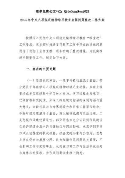 【七哥公文】2025年:2025年中央八项规定精神学习教育查摆问题整改工作方案+更多免费公文+VX:QiGeGongWen2024+更多免费公文+VX:QiGeGongWen2024