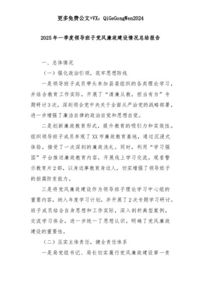 【七哥公文】2025年:2025年一季度领导班子党风廉政建设情况总结报告+更多免费公文+VX:QiGeGongWen2024+更多免费公文+VX:QiGeGongWen2024