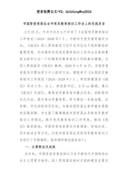【七哥公文】2025年:市国资委党委在全市党员教育培训工作会上的交流发言+更多免费公文+VX:QiGeGongWen2024+更多免费公文+VX:QiGeGongWen2024