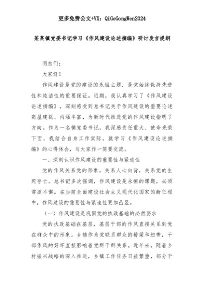 【七哥公文】2025年:某某镇党委书记学习《作风建设论述摘编》研讨发言提纲+更多免费公文+VX:QiGeGongWen2024+更多免费公文+VX:QiGeGongWen2024